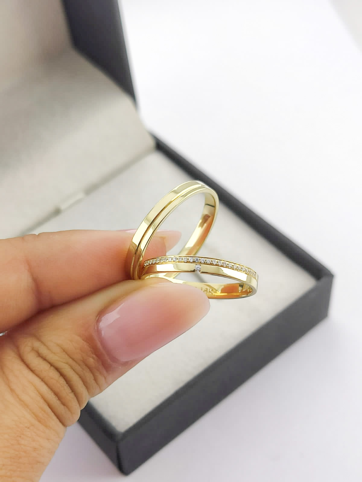 ACABAMENTO: Brilhosa (polido) com friso central, cravejada.