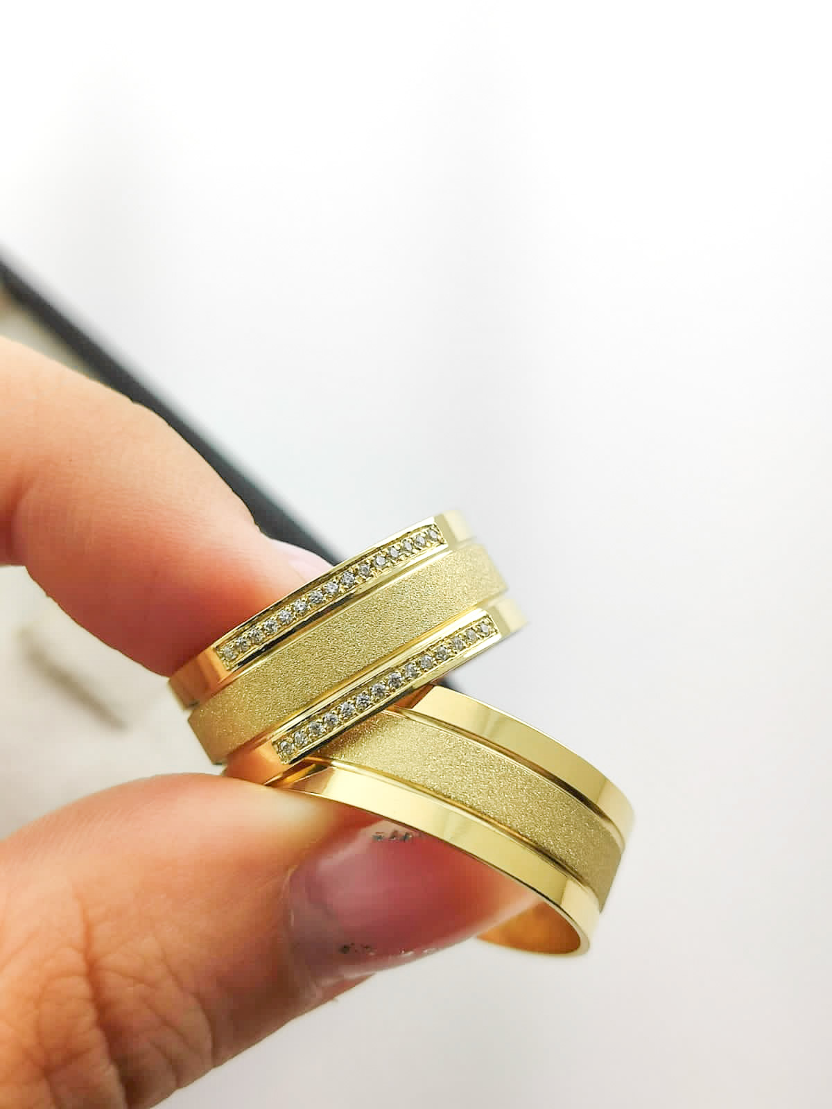 ACABAMENTO: Brilhosa (polido) com friso central, cravejadas.